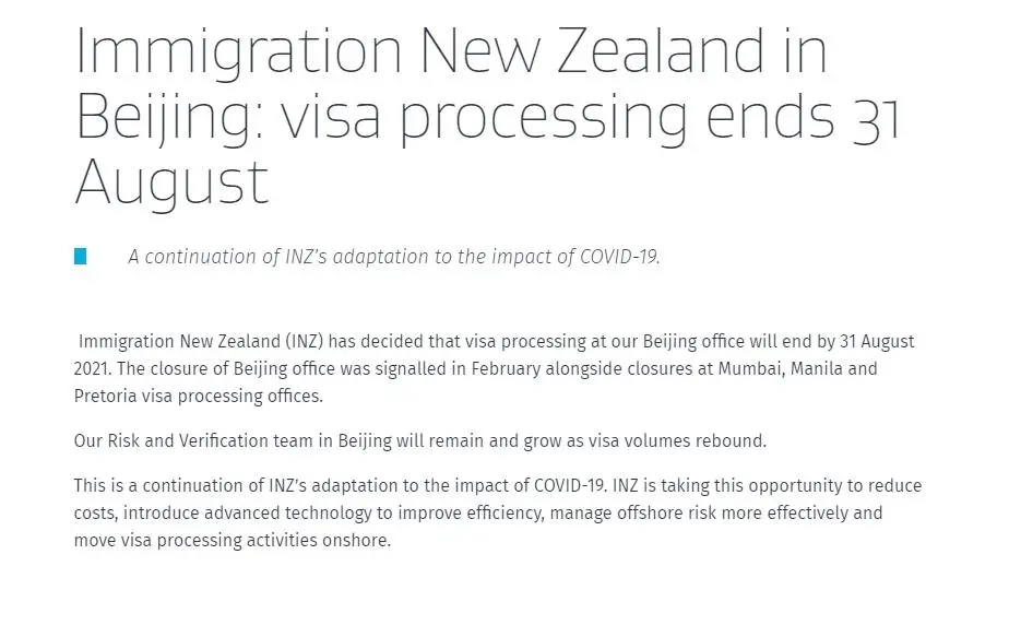新西蘭移民局今日發(fā)布消息稱:北京簽證審理中心將會(huì)在8月31日關(guān)閉!