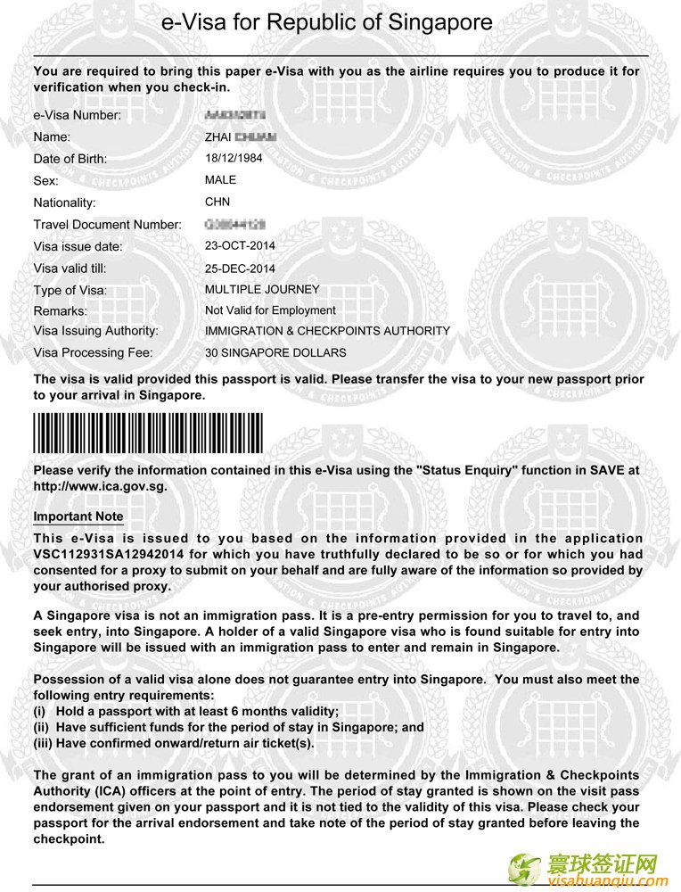 翟先生的新加坡旅游簽證頁: