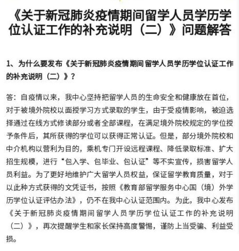 對(duì)此,教育部留學(xué)服務(wù)中心25日發(fā)布了《關(guān)于新冠肺炎疫情期間留學(xué)人員學(xué)歷學(xué)位認(rèn)證工作的補(bǔ)充說明(二)》問題解答進(jìn)行解惑和回應(yīng)。