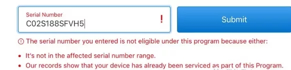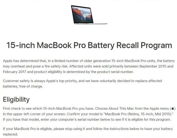 大家只需要在蘋果公司公布的網(wǎng)頁內(nèi)將序列號輸入,即可查看自己的電腦是否在更換范圍內(nèi)。具體產(chǎn)品序列號可通過https://support.apple.com/15-inch-macbook-pro-battery-recall查詢。