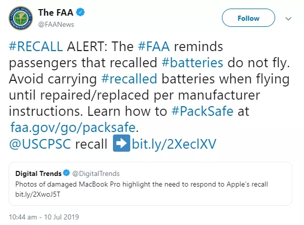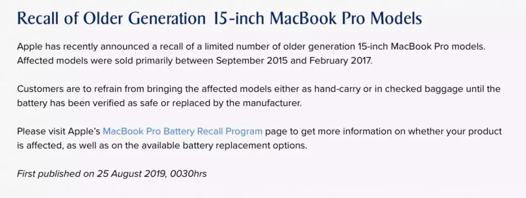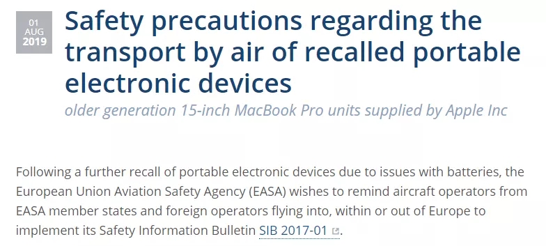 同樣地,本月早些時候,歐盟航空安全局(EASA)對這些蘋果筆記本電腦機(jī)型也發(fā)出了警告,要求該地區(qū)的航空公司嚴(yán)格遵守2017年的規(guī)定,關(guān)閉含有被召回鋰離子電池的設(shè)備,不得在飛行中使用。