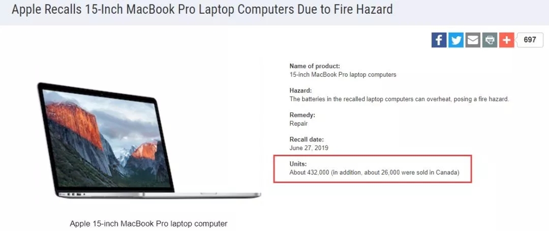 據(jù)召回信息顯示,美國一共有43.2萬臺受影響的15寸MacBook Pro筆記本電腦。而本次召回,加拿大也受到影響,共有2.6萬臺該類型的蘋果筆記本電腦。