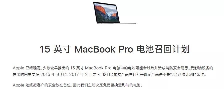 蘋果此次召回計劃針對的是在2015年9月和2017年2月之間售出的15英寸MacBook Pro機(jī)型,由于這期間部分機(jī)型搭載Retina屏幕的15吋MacBook Pro筆電型號電池,可能存在過熱且起火的風(fēng)險,因此呼吁用戶停止使用,同時也宣布將為受影響用戶免費更換電池。