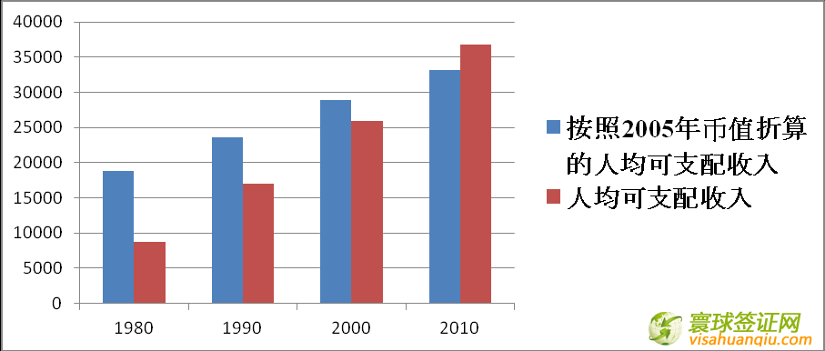 而且近30年來總的趨勢,無論是按照美元當(dāng)前值還是按照計入通貨膨脹之后的實際購買力折算,都在持續(xù)增長。圖二顯示的是從1980年到2010年的人均可支配收入(紅色)和按照2005年幣值折算的人均可支配收入。