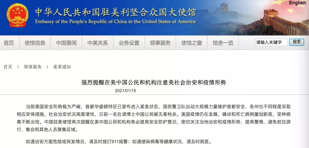 中國(guó)駐美使館發(fā)提醒:在美中國(guó)公民和機(jī)構(gòu)注意美社會(huì)治安和疫情形勢(shì)