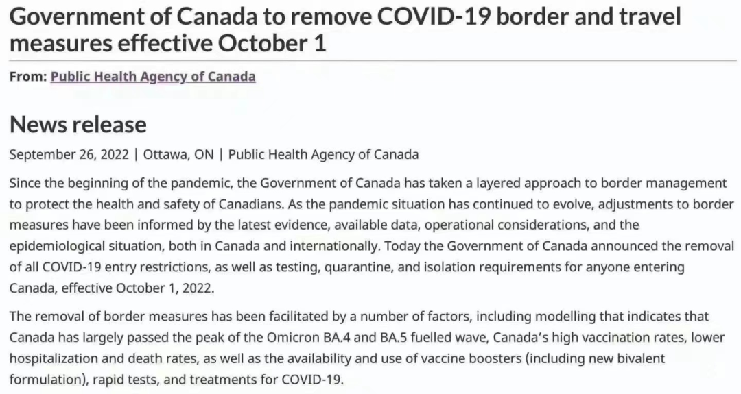 加拿大聯(lián)邦政府宣布,10月1日起,將取消所有COVID-19 入境限制