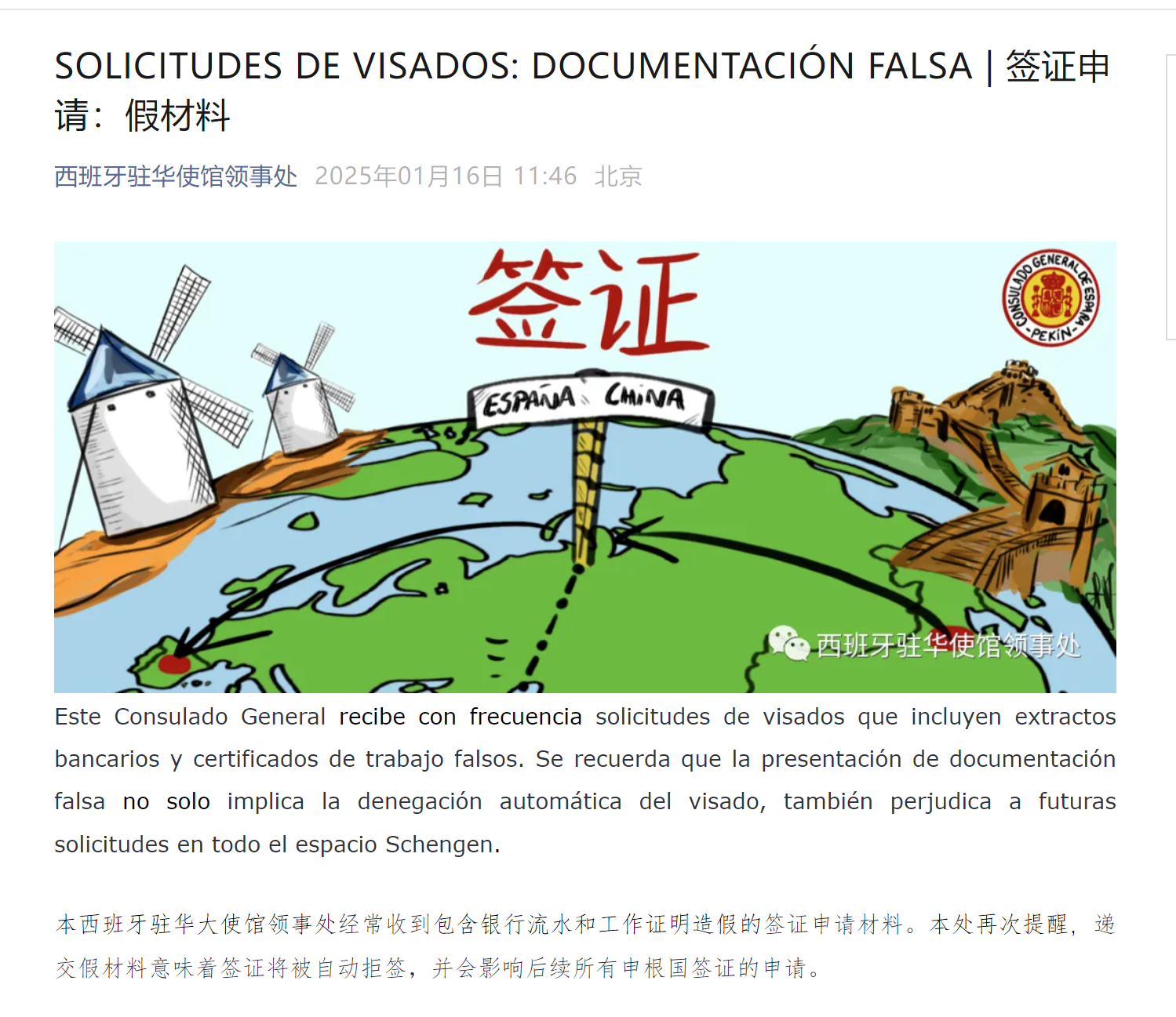 西班牙駐華使館公眾號提醒:申請簽證時如果遞交假材料意味著簽證將被自動拒簽