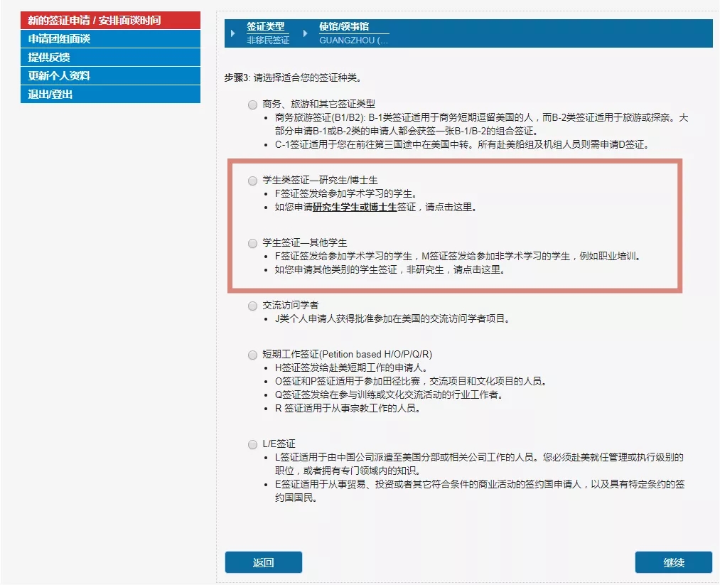 美國使館官網(wǎng)的簽證申請類型也增加了兩項“學(xué)生簽證-研究生/博士”和“學(xué)生簽證-其他學(xué)生”