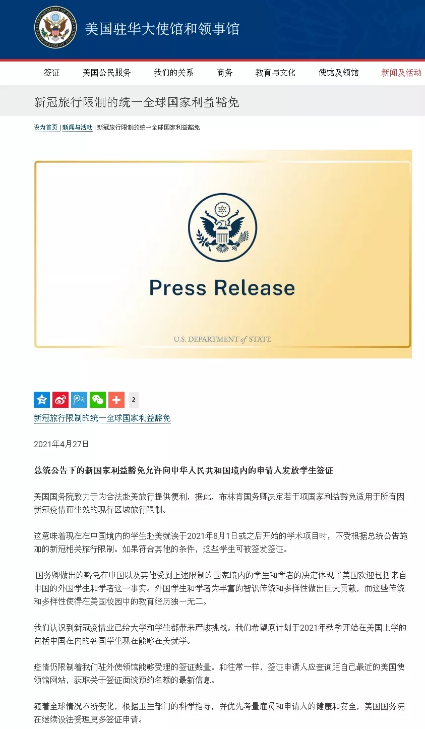 繼美國國務(wù)院發(fā)布“F1/M1中國留學(xué)生自動獲得NIE豁免直飛美國”的消息后,4月28日,美國駐華使館正式發(fā)布通知:
