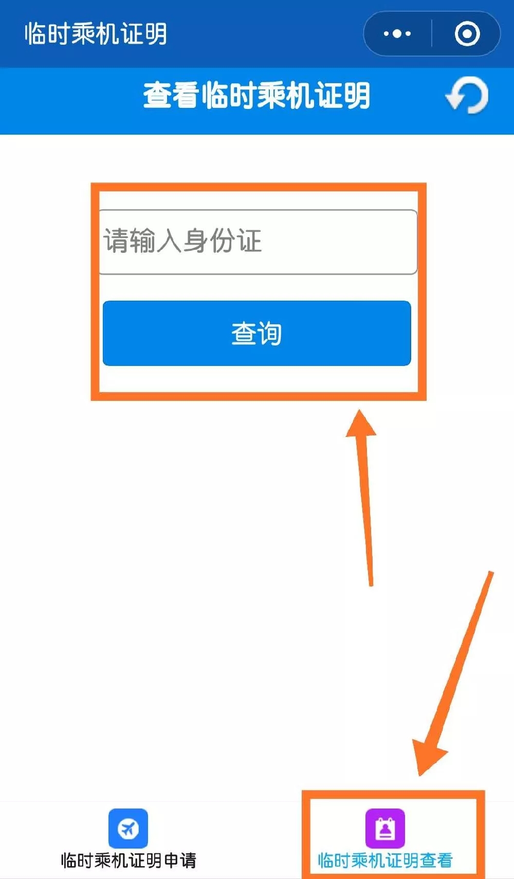 第三步:查看已申請(qǐng)的臨時(shí)乘機(jī)證明,點(diǎn)擊“臨時(shí)乘機(jī)證明查看”,然后輸入“身份證號(hào)”,即可查詢。