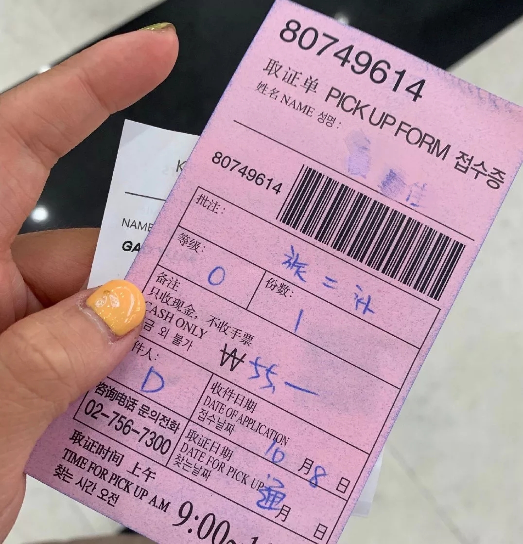 第二天一早去警察局👮♀️報案登記,填了信息我要了一張遺失護照證明,就去了領事館(⚠️注意是中國駐首爾大使館領事部,千萬別走錯)去之前準備好證明身份的(身份證等進大使館會有人查看才讓進)➕韓元現(xiàn)金,流程:排號——填兩張資料——拍照(有自備證件照的可以不用,現(xiàn)場拍照的話只收韓元1W)——叫號在窗口說明情況,把自己說慘一點并加急處理——拿到臨時簽證申請單(粉紅色)——等電話(一般下午三四點左右打電話五點前都可以拿到)——繳費拿證(5.5w韓元🉑️微信支付寶付款)