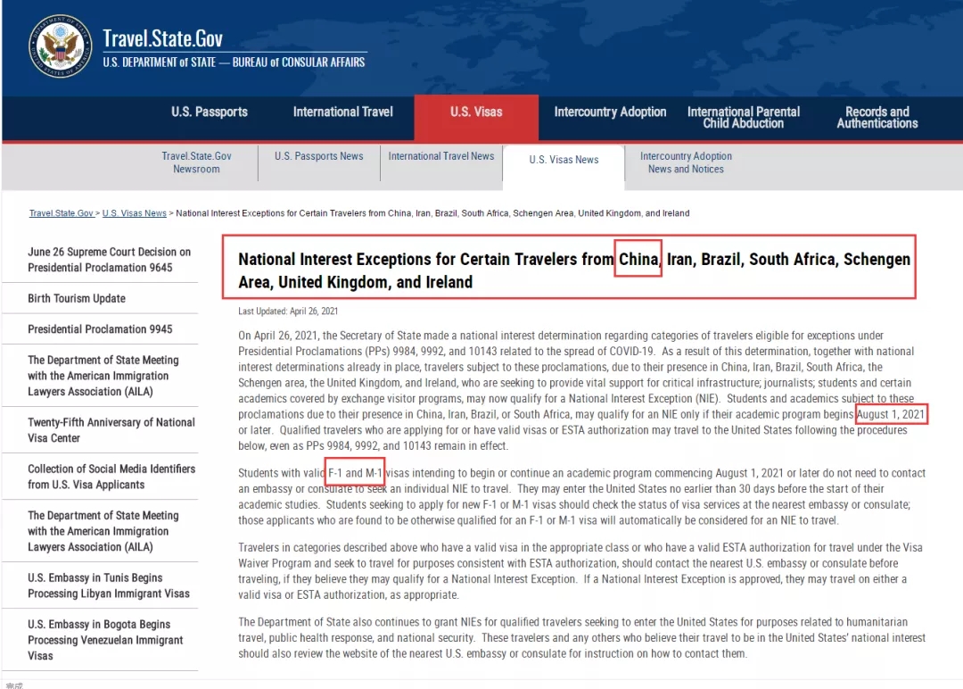美國當(dāng)?shù)貢r(shí)間2021年4月26日,美國國務(wù)院官方網(wǎng)站發(fā)布了一則重要消息:2021年8月1日之后開學(xué)的包含中國在內(nèi)的幾個(gè)國家留學(xué)生可以自動獲得NIE豁免!