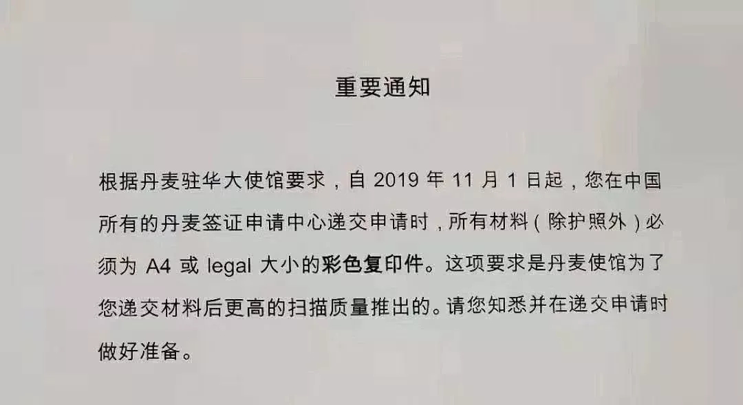 根據丹麥駐華大使館的最新要求,自2019年11月1日期,遞交簽證時,所有資料(除護照外)必須為A4或legal大小的彩色復印件。