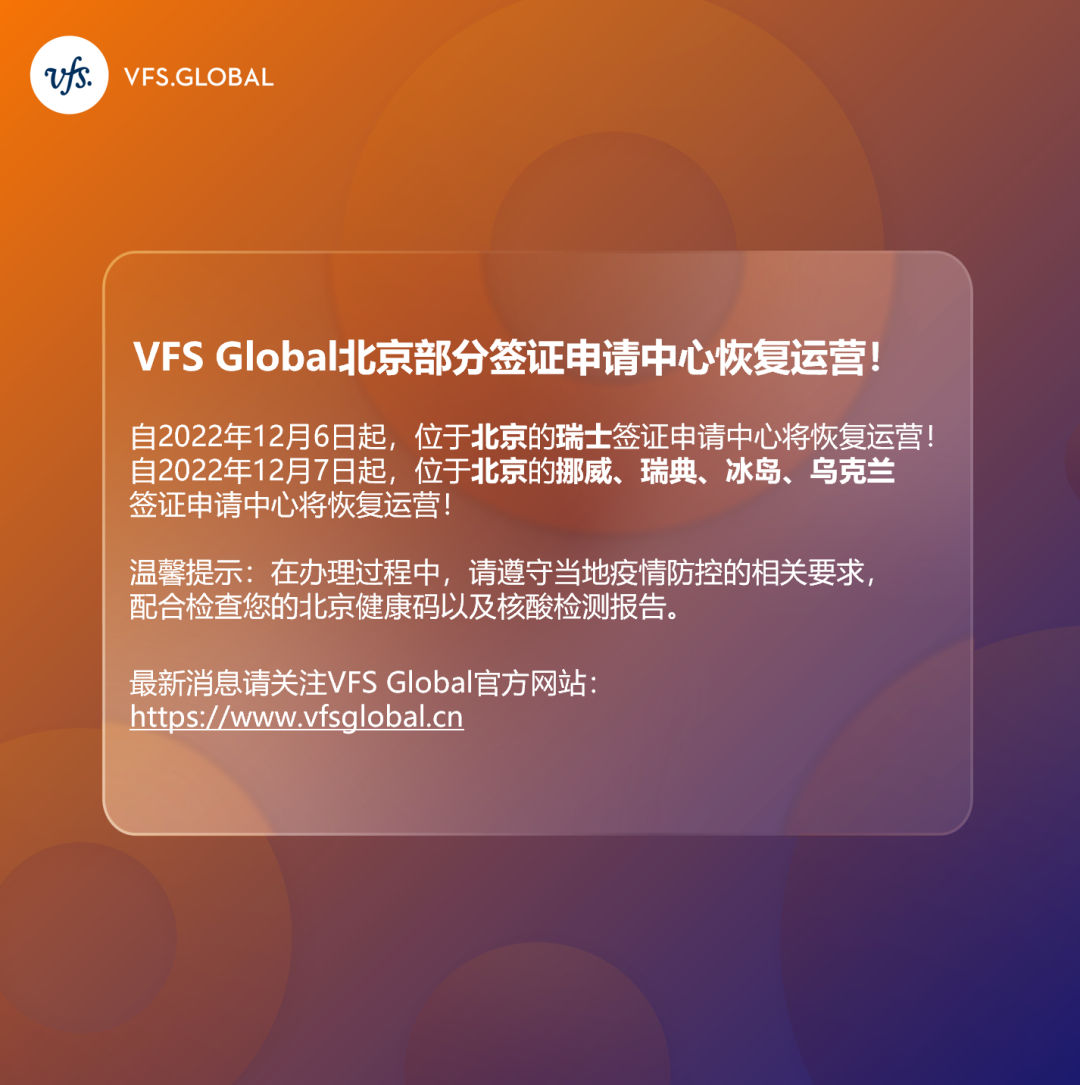 自2022年12月7日起,VFS Global位于北京的挪威、瑞典、冰島、烏克蘭簽證申請(qǐng)中心將恢復(fù)運(yùn)營(yíng)!