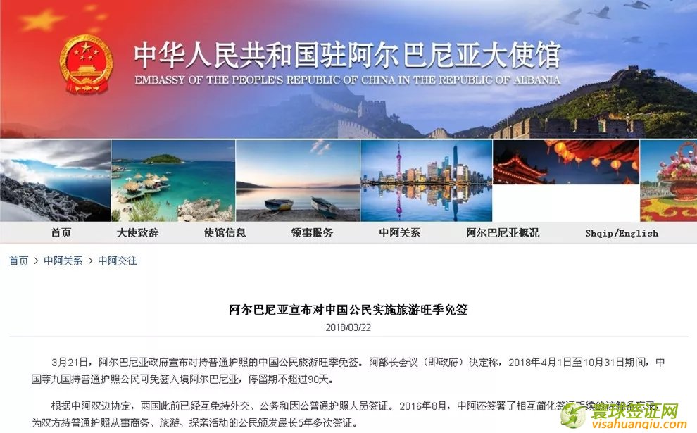 3月21日,阿爾巴尼亞政府宣布對持普通護(hù)照的中國公民旅游旺季免簽。阿部長會議(即政府)決定稱,2018年4月1日至10月31日期間,中國等九國持普通護(hù)照公民可免簽入境阿爾巴尼亞,停留期不超過90天。