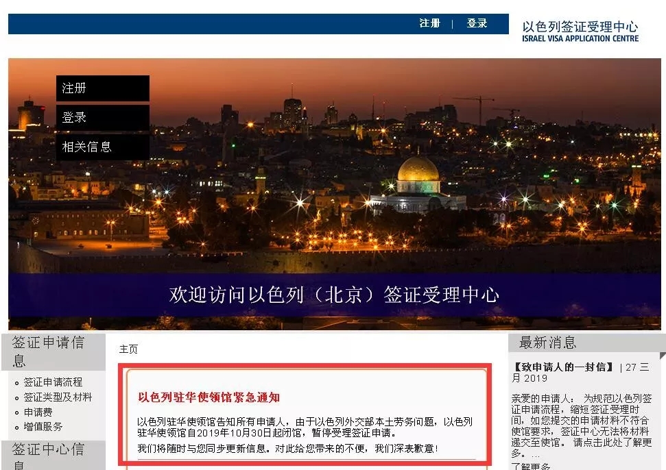 以色列駐華使領(lǐng)館告知所有申請(qǐng)人,由于以色列外交部本土勞務(wù)問題,以色列駐華使領(lǐng)館自2019年10月30日起閉館,暫停受理簽證申請(qǐng)。我們將隨時(shí)與您同步更新信息。對(duì)此給您帶來的不便,我們深表歉意!