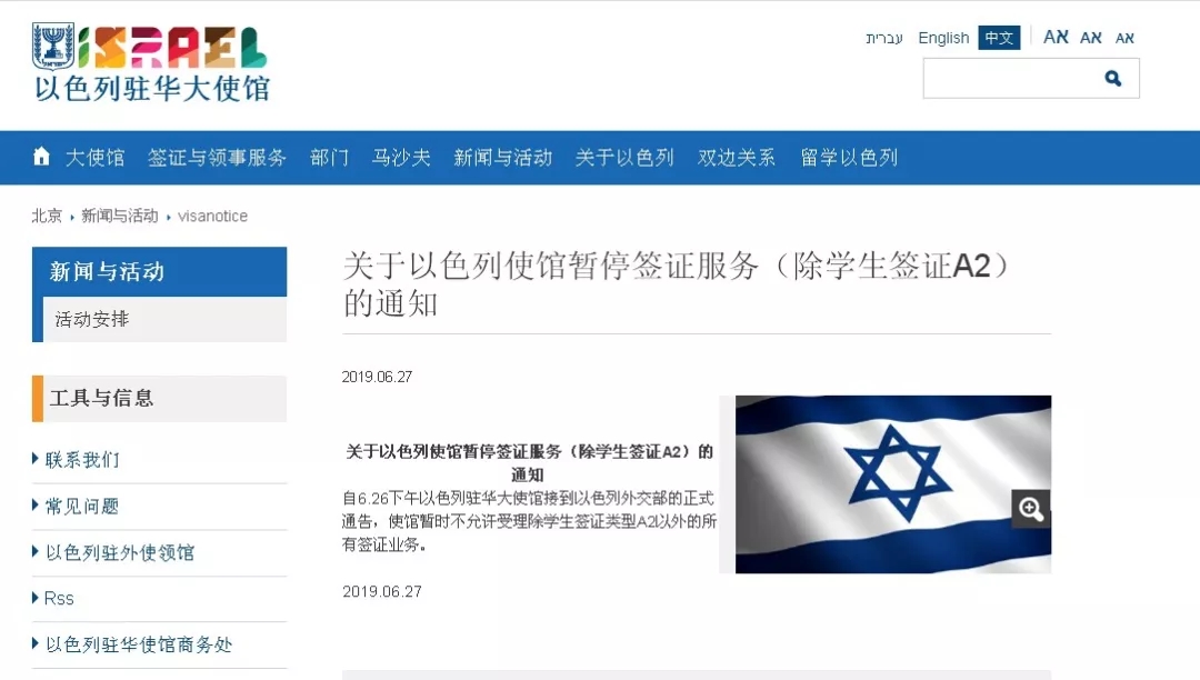 今年6月26日,以色列使館突然宣布接到以色列外交部通報(bào),暫停簽證業(yè)務(wù)。7月22日恢復(fù)領(lǐng)事服務(wù)