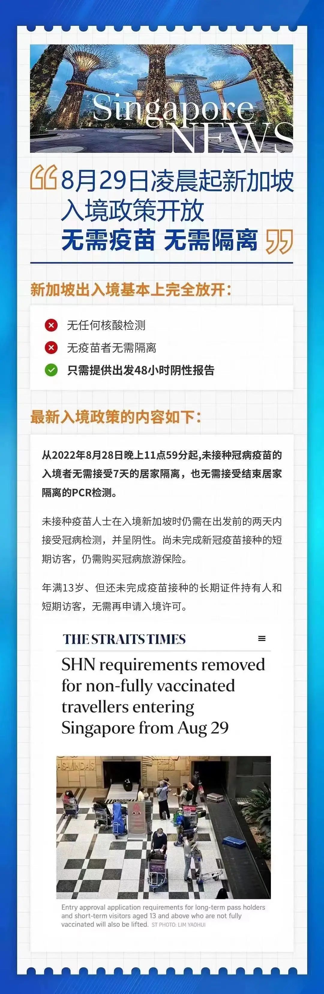 據(jù)新加坡政府官方網(wǎng)站顯示,自8月28日晚11時59分起,所有入境新加坡的旅客即使沒有完成新冠疫苗接種,抵境后也不再需要履行七天居家政策,但仍須在行前兩天內(nèi)取得新冠病毒陰性檢測證明。