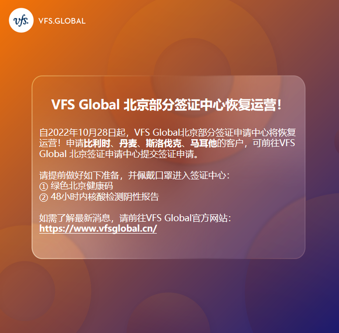 自2022年10月28日起,VFS Global北京比利時(shí)、丹麥、斯洛伐克、馬耳他簽證申請中心將重新開放!