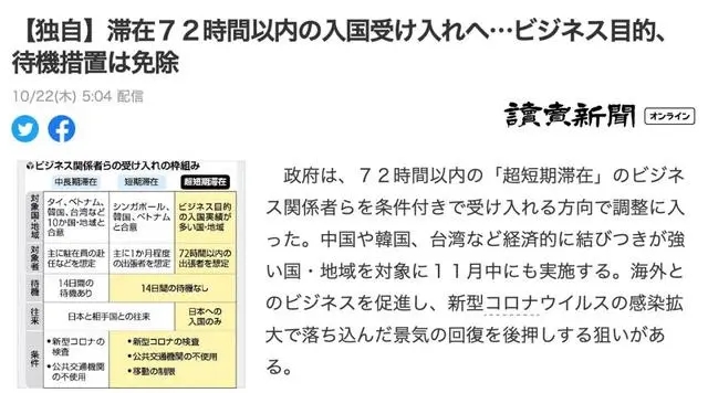 據(jù)共同社報道,日本政府官員22日透露,政府開始協(xié)調(diào)并有條件地允許出于“超短期”商業(yè)目的在72小時內(nèi)入境。此舉旨在促進(jìn)在新型冠狀病毒疫情下與海外國家的業(yè)務(wù)。這種做法最早將于11月推出。